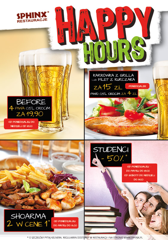 W ramach oferty happy hours restauracje Sphinx proponują: